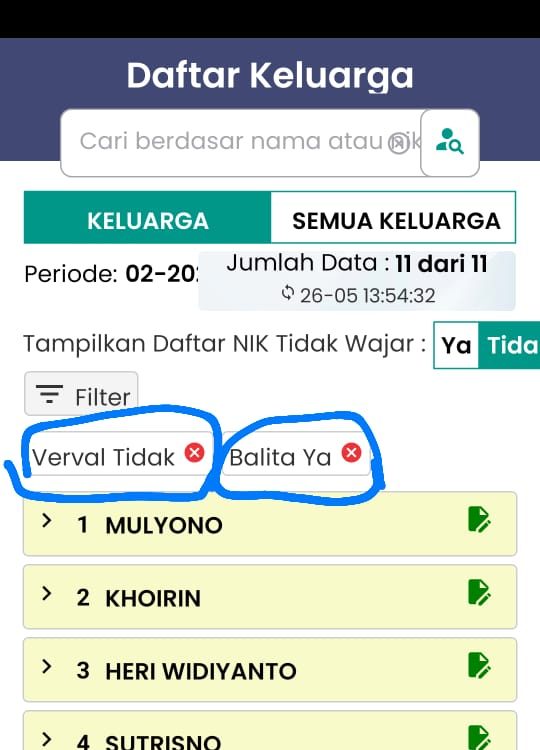 Kedua, jika memang benar bahwa di perangkat lain tersebut juga muncul data dobel yang sama seperti di HP Kader, silakan cek tiap data Keluarga yang dobel-dobel tersebut secara detail, termasuk berapa jumlah dan nama-nama masing-masing anggota keluarganya, lalu ikuti petunjuk di bawah ini: