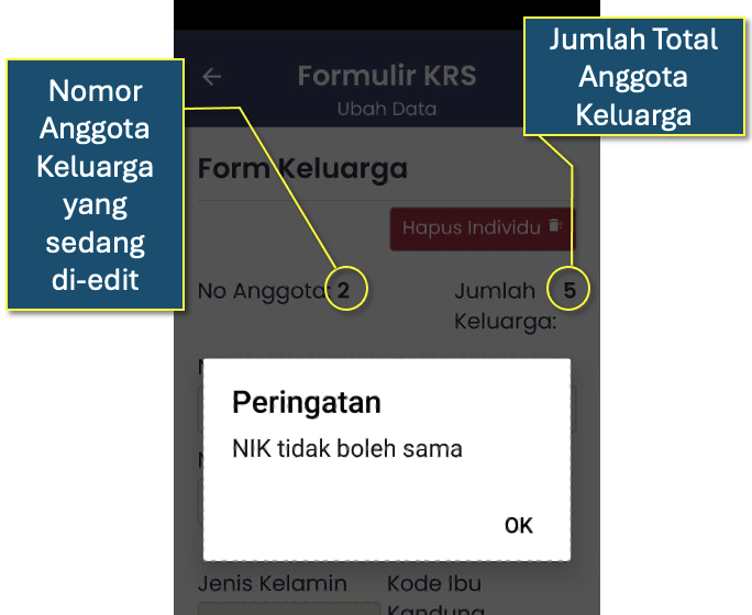Maka Kader harus mencari di mana NIK kembar tersebut hingga Anggota Keluarga ke-5 (pencarian tidak hanya sampai Anggota Keluarga ke-2 saja). Kebanyakan Kader belum memeriksa NIK hingga anggota keluarga yang terakhir.